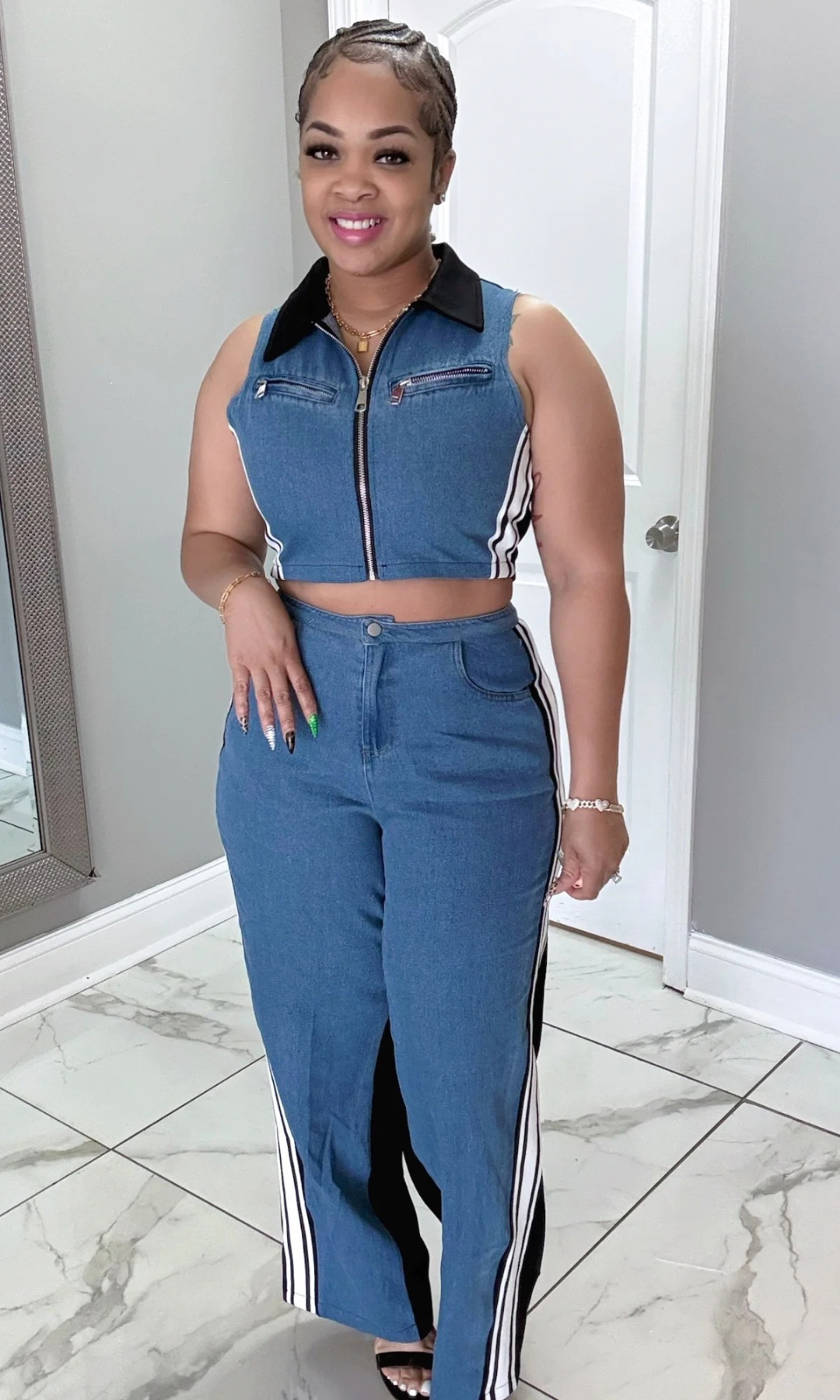 The Ashley crop jacket combines elegant design with versatile functionality, making it a standout piece for any wardrobe. Crafted from premium materials, this jacket and wide legged pants set offers durability without compromising on comfort. Featuring a modern stripe pattern and a classic jean-inspired aesthetic, it seamlessly blends timeless style with contemporary trends. Its cropped silhouette is perfect for layering, whether paired with casual outfits or dressed up for a more polished look. The Ashley crop jacket set is a practical yet stylish choice for those seeking a balance of sophistication and everyday wearability.