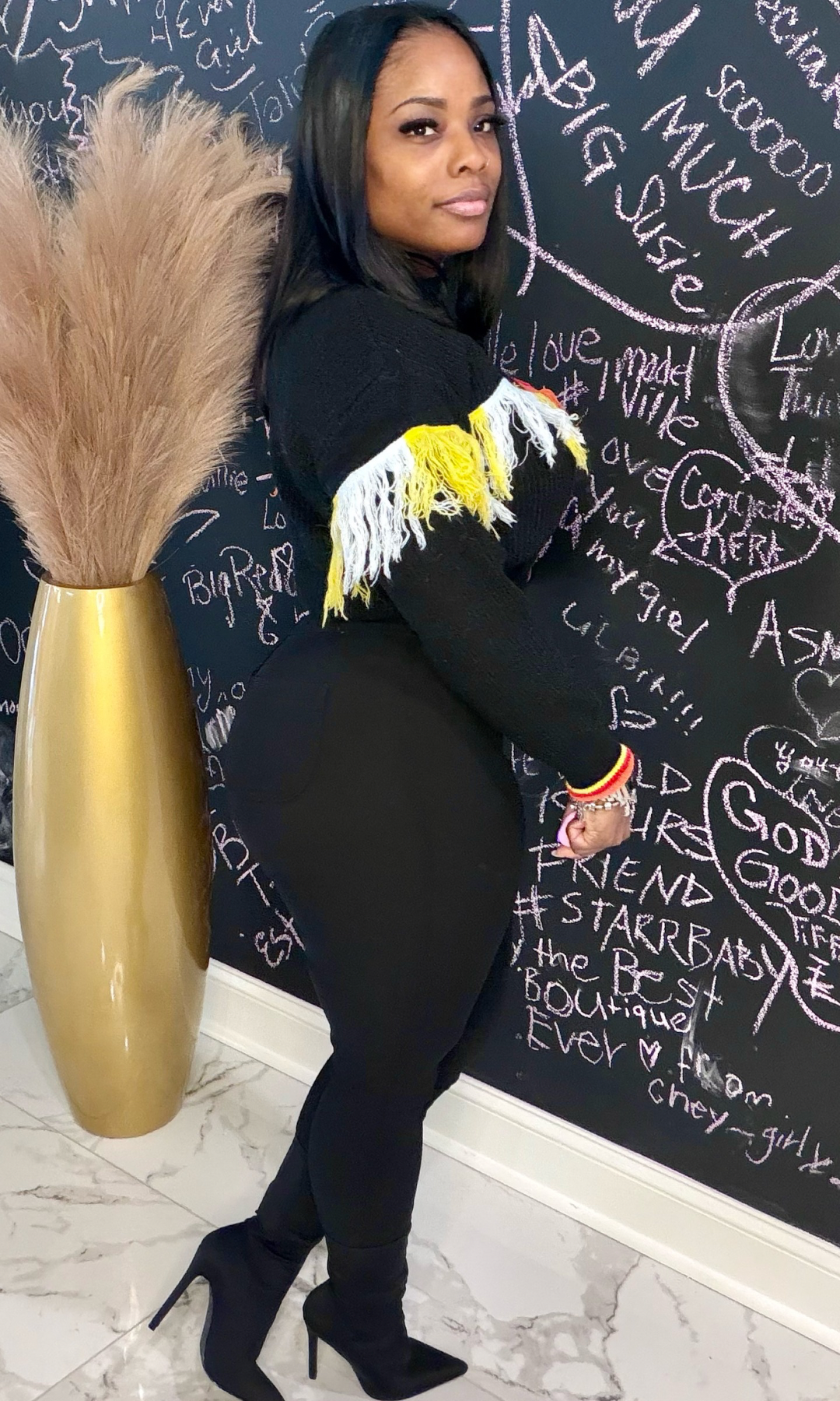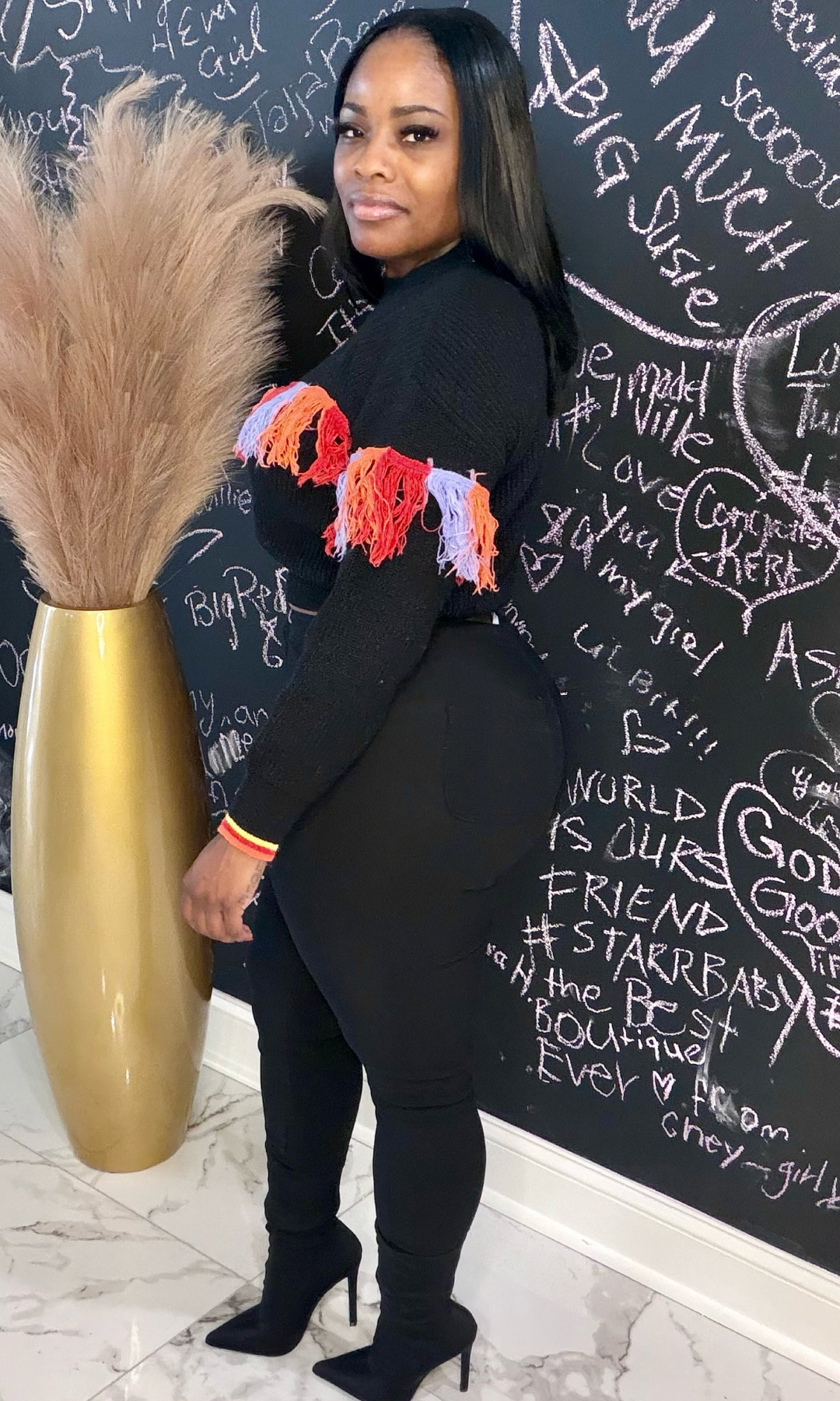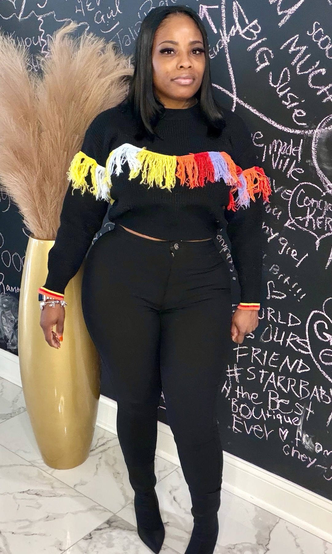 Add some playful energy to your look with our Fringe Pop Knit Sweater! This black knit pullover features bold, multicolor fringe detailing across the chest and sleeves for a fun, statement-making twist on cozy fashion. The soft stretch knit provides a comfortable fit that keeps you stylish and warm all season long. Perfect for adding a little color and personality to your everyday wardrobe!
