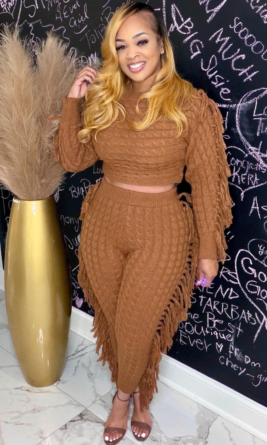 Stay cozy but keep it fashion-forward in our Fringe Fever Knit Set! This bold, statement two-piece combines warmth, texture, and attitude. Designed with a soft cable-knit pattern, this set features dramatic fringe detailing down the sleeves and legs that move with every step ā making it a total showstopper for the fall and winter season. The cropped off-shoulder sweater pairs perfectly with high-waisted knit pants for a flattering, body-hugging look.