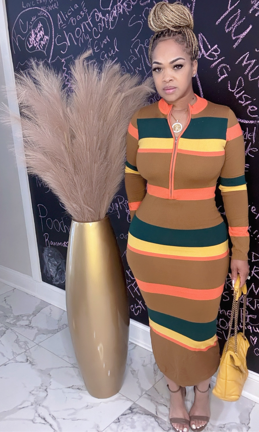 The “Fall Into Chic” Striped Midi Dress is that effortless piece that hugs your curves in all the right places while keeping it classy and comfortable. With bold autumn tones and a zip-front collar, this dress transitions perfectly from brunch to date night.