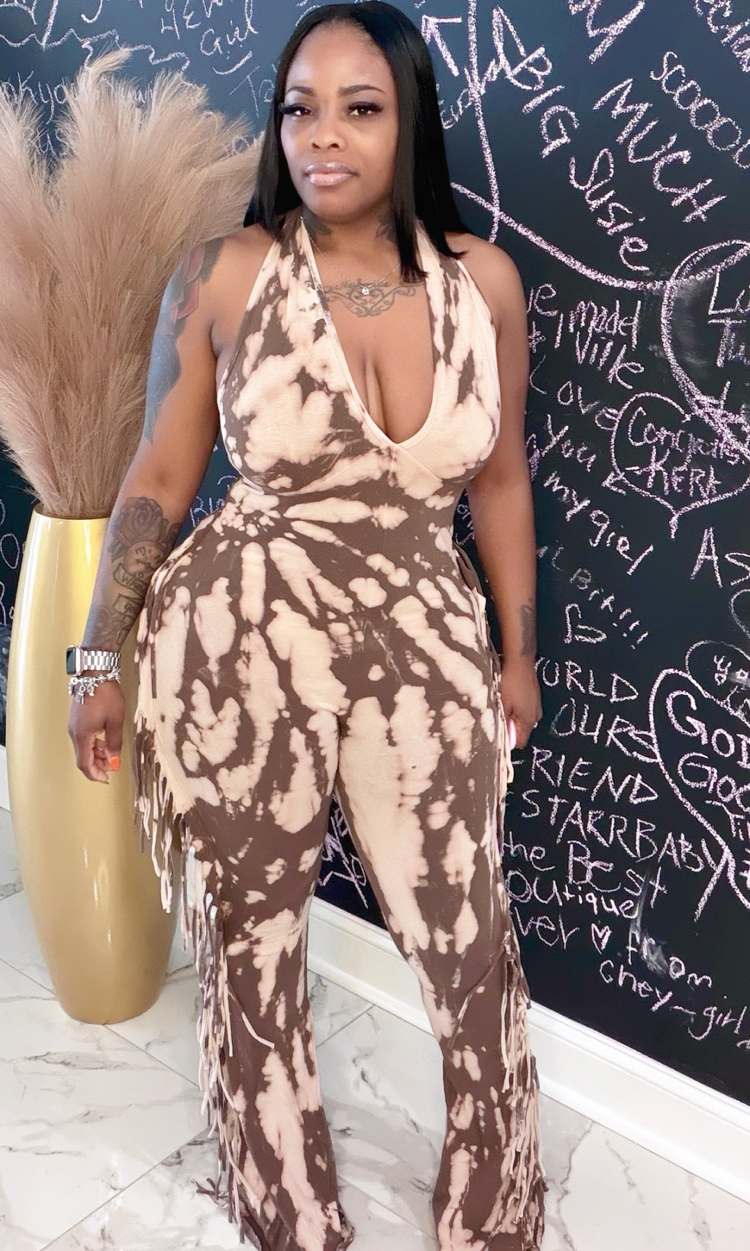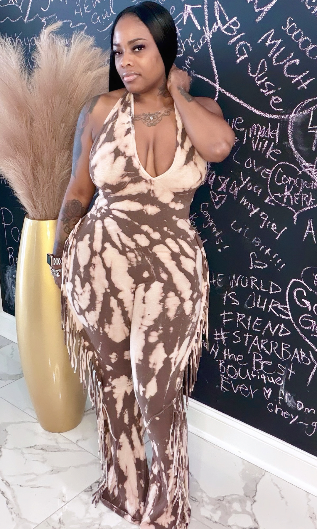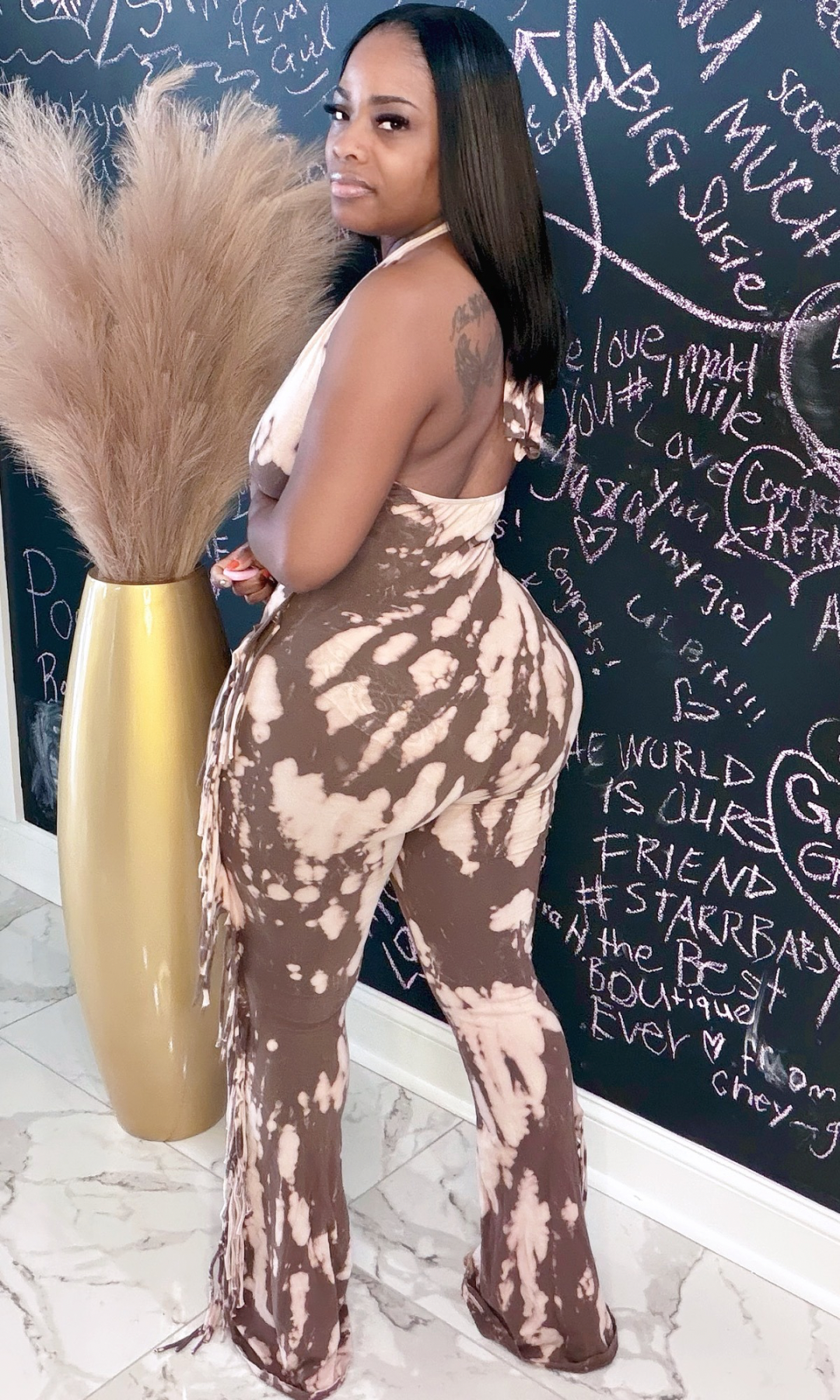 Make a bold statement in our Mocha Splash Fringe Jumpsuit! Designed to turn heads, this halter-style jumpsuit features a deep plunging neckline, curve-hugging fit, and eye-catching fringe accents along the sides for added movement and flair. The unique mocha tie-dye print blends confidence with comfort, making it perfect for nights out, parties, or statement daytime looks.