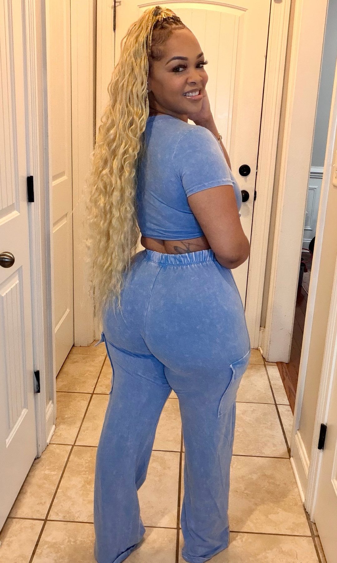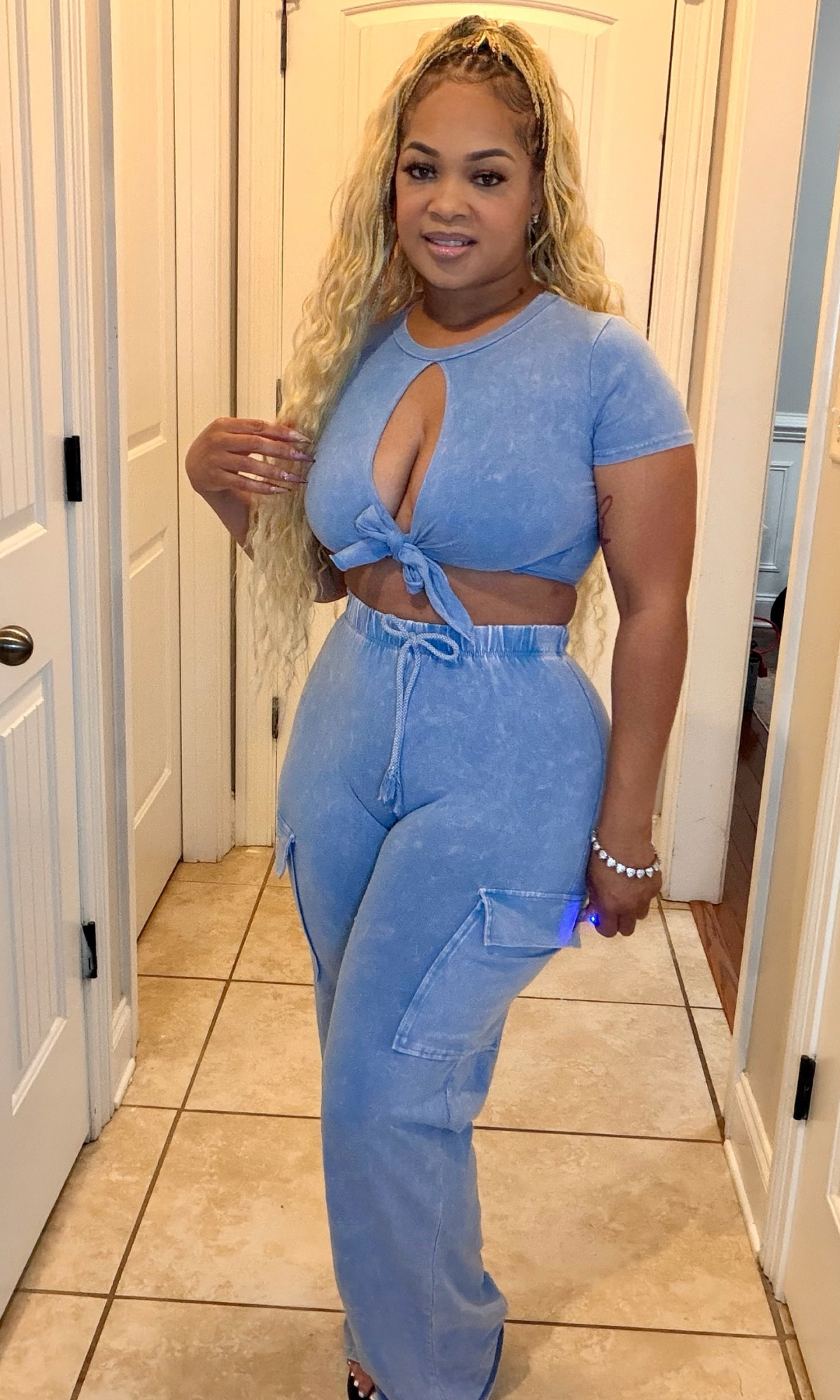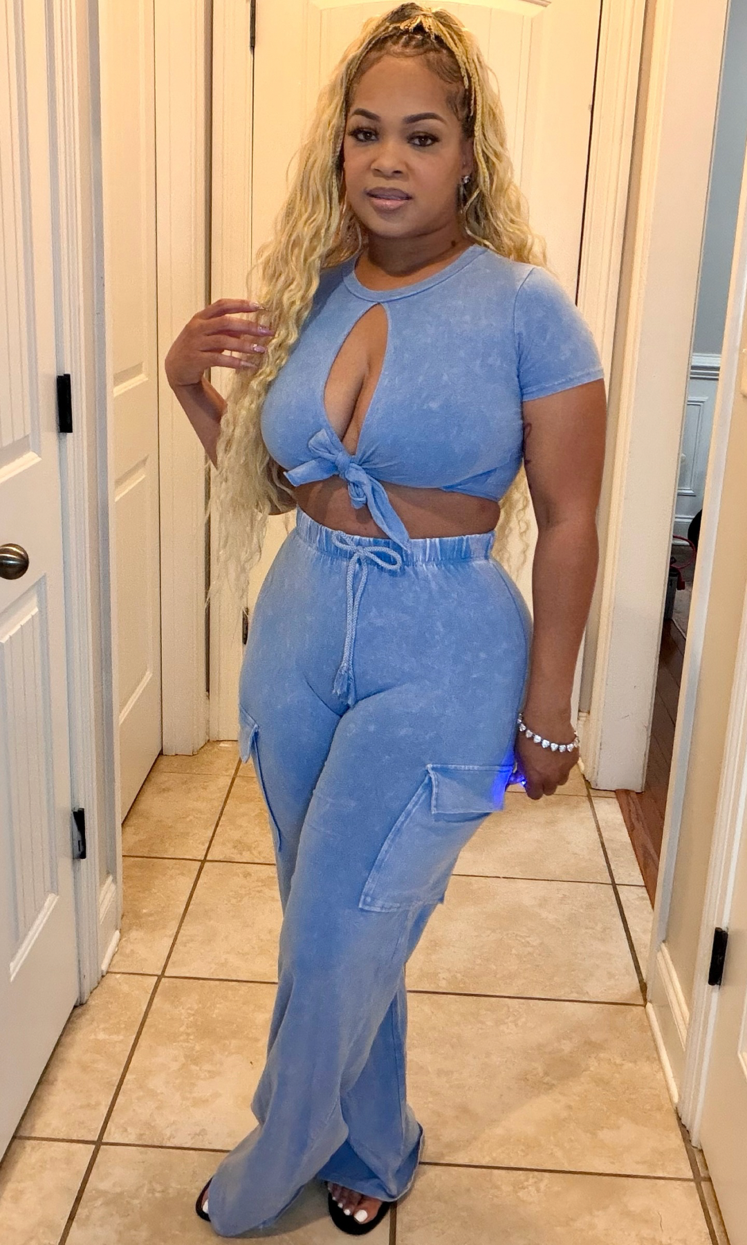The set features a short sleeve tie-front crop top with a flattering keyhole detail paired with high-waisted mineral wash cargo pants with functional pockets and an adjustable drawstring waist. The soft washed blue tone gives the outfit a laid-back vibe while the flattering fit highlights your curves.