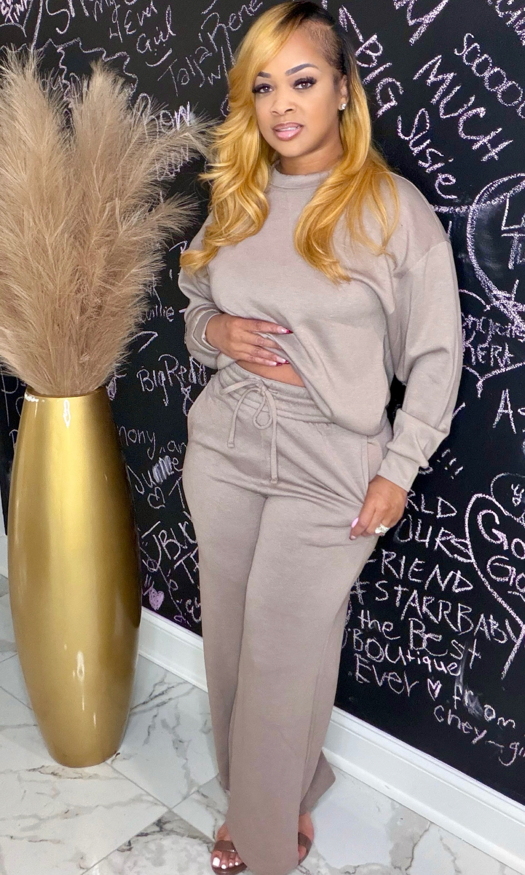 Effortless comfort meets understated luxury with our “Soft Life Lounge Set.” This neutral two-piece features a relaxed crewneck top and matching wide-leg pants with an adjustable drawstring waist. The buttery-soft material feels cozy yet polished — perfect for lounging, running errands, or casual coffee dates. Because looking put together shouldn’t have to mean sacrificing comfort.