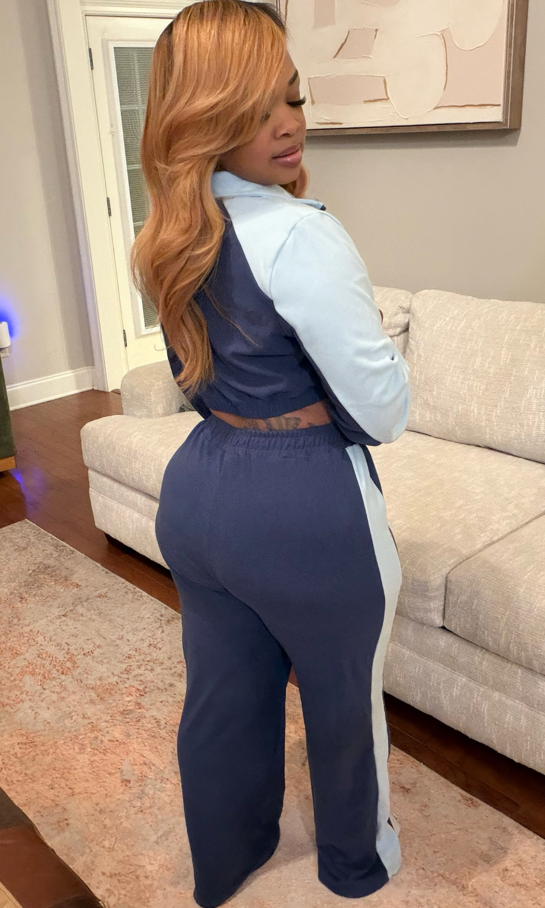 The Shades of Blue Set gives effortless luxury with its soft color-block design and comfy fit. This two-piece look is perfect for casual days, travel, or just lounging in style. The cropped zip top pairs perfectly with high-waisted pants for a flattering, feminine finish.