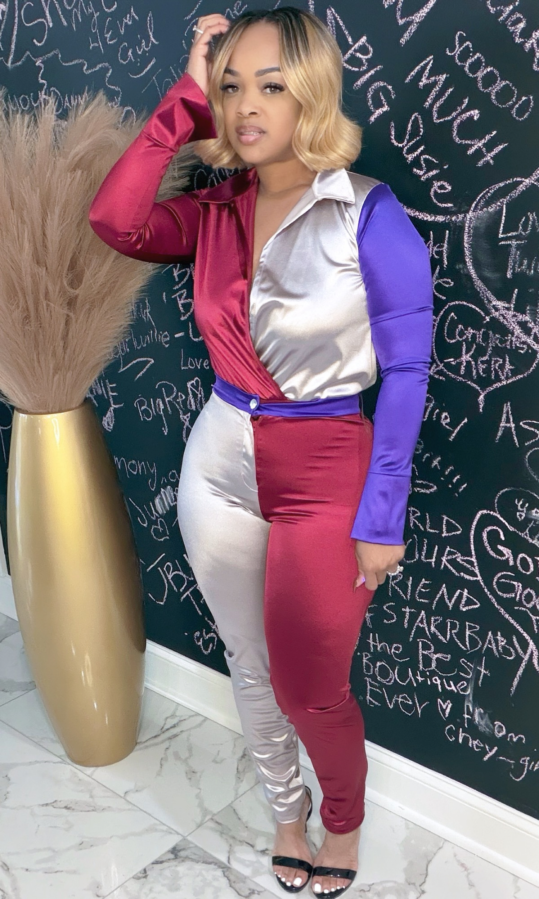 Make a statement in our Bold Moves Color Block Jumpsuit! This silky, figure-hugging one-piece features a daring tri-tone mix of burgundy, cream, and royal purple — designed for the woman who commands attention. The collared neckline and button-down front add a sleek, tailored finish, while the stretch satin fabric gives you that curve-loving fit and high-end shine.
