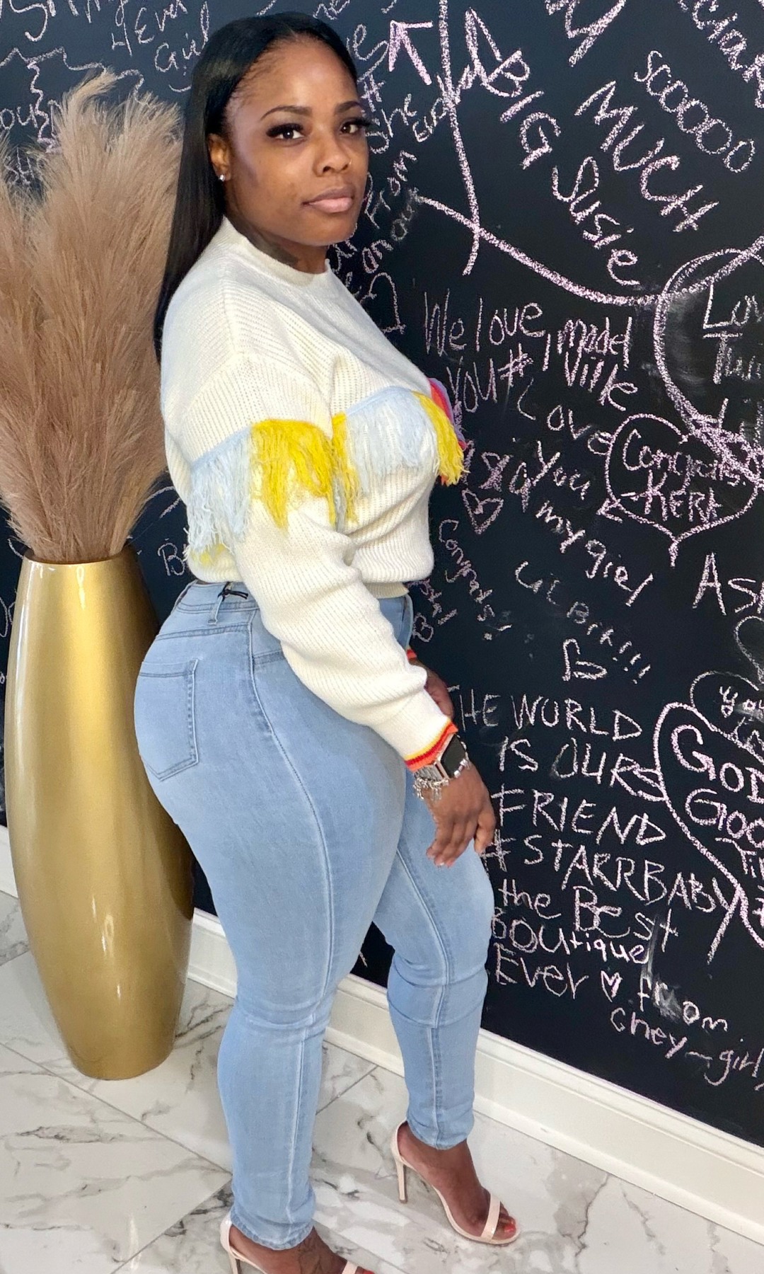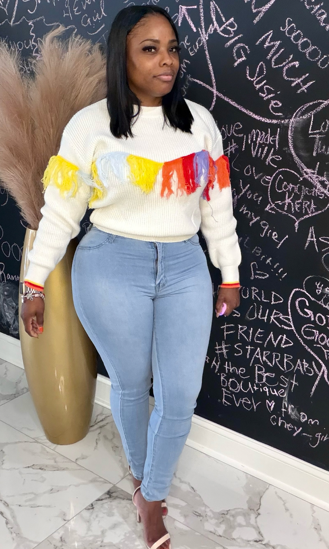 Turn heads with our Cream Fringe Pop Sweater! This cozy knit pullover features bold, multicolor fringe details across the chest and sleeves — adding a fun and vibrant twist to your fall and winter looks. Made from a soft and stretchy knit material, it delivers both comfort and style in one chic statement piece. Perfect for casual days, brunch dates, or whenever you want to add a pop of color to your wardrobe.